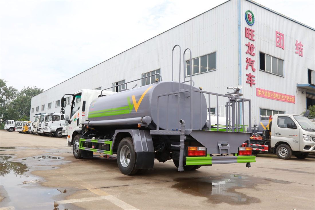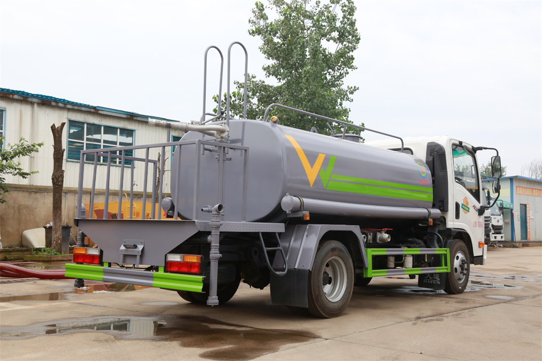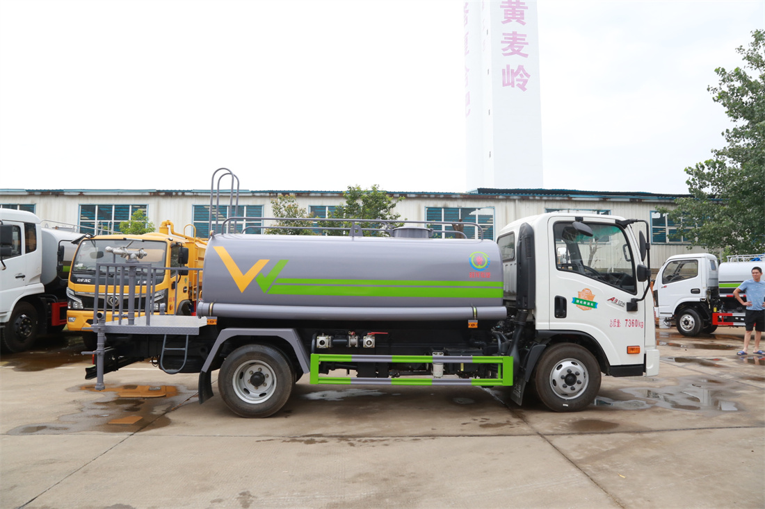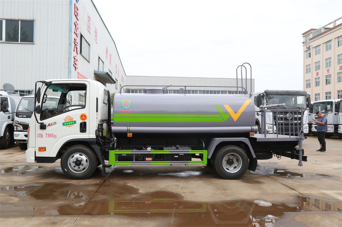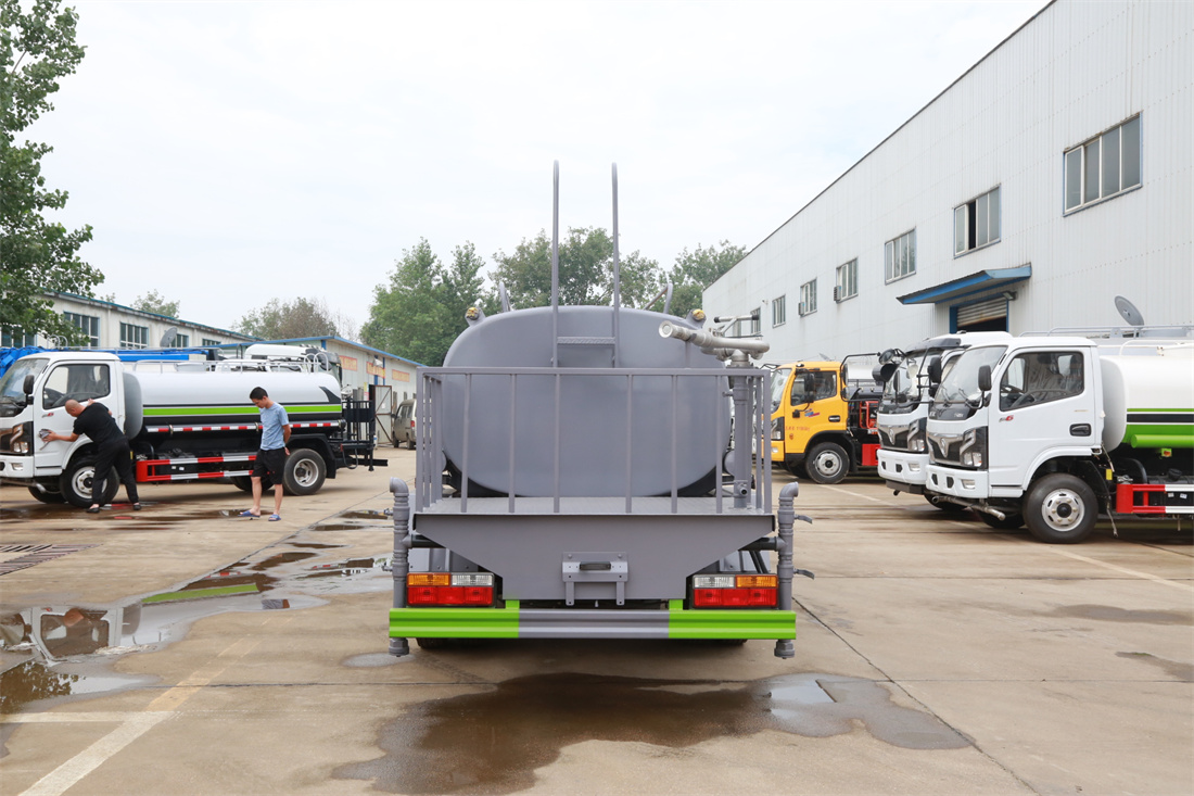 灑水車前裝有鴨形噴嘴或圓頭沖嘴,后面裝有圓柱開灑水噴嘴或蓮蓬頭噴嘴,后部有一工作平臺(tái),裝配有水炮。后部還可裝8個(gè)噴嘴(選裝)。