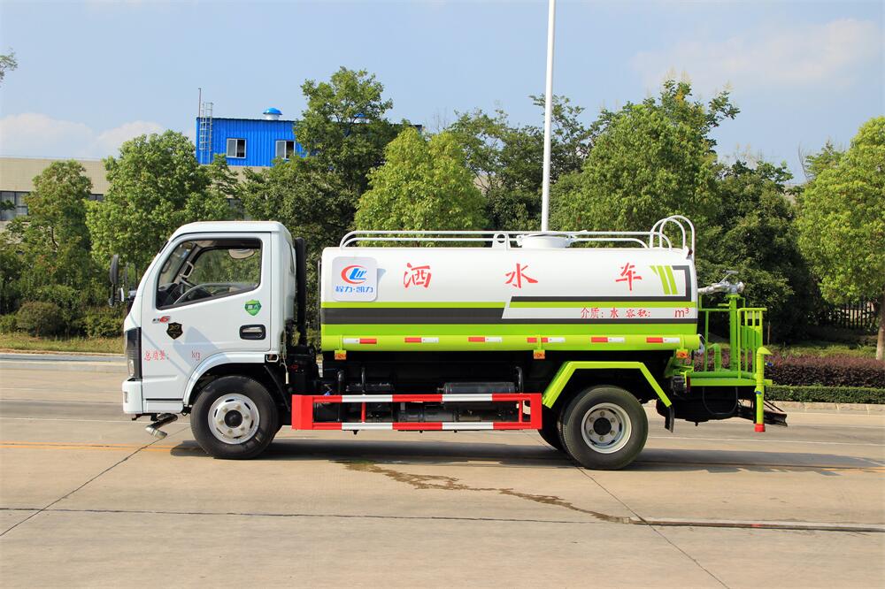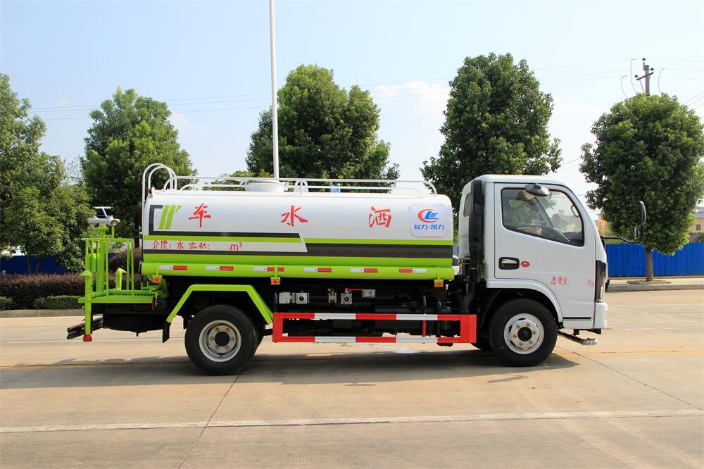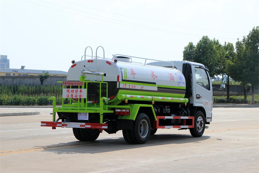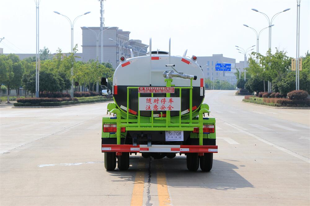 灑水車前裝有鴨形噴嘴或圓頭沖嘴,后面裝有圓柱開灑水噴嘴或蓮蓬頭噴嘴,后部有一工作平臺(tái),裝配有水炮。后部還可裝8個(gè)噴嘴(選裝)。
