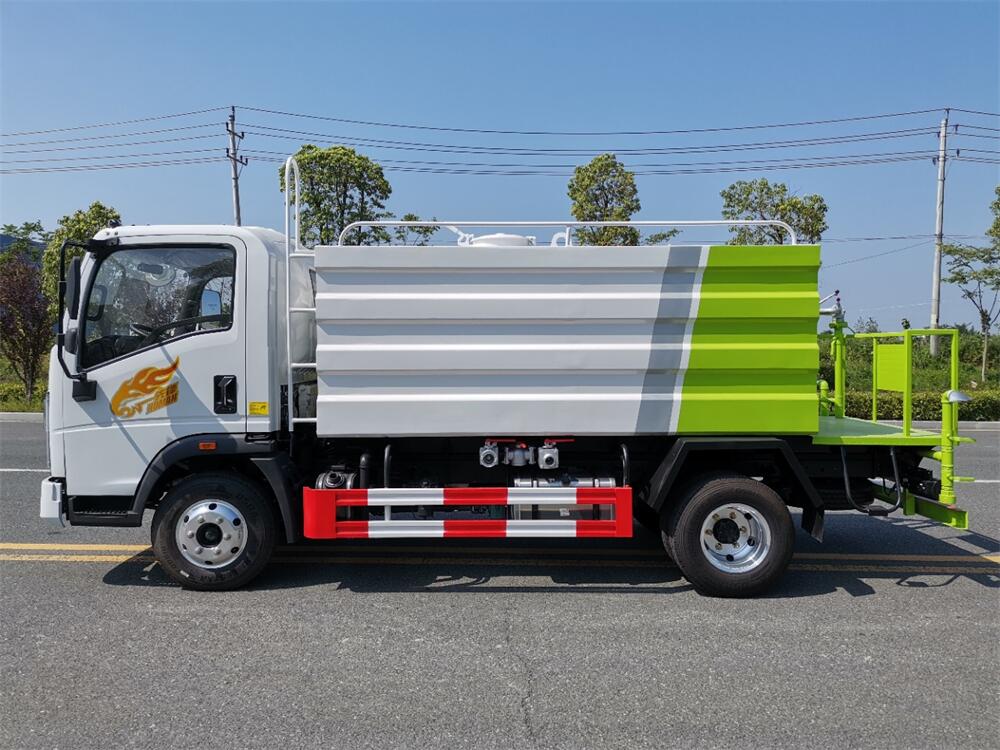 灑水車前裝有鴨形噴嘴或圓頭沖嘴,后面裝有圓柱開灑水噴嘴或蓮蓬頭噴嘴,后部有一工作平臺,裝配有水炮。后部還可裝8個噴嘴(選裝)。