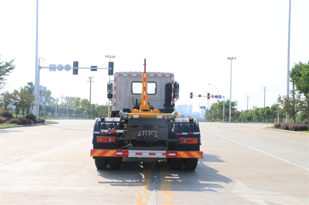 該款鉤臂式垃圾車由液壓系統、操作系統組成。舉升油制缸(1支)系國內知名液壓件廠家生產的雙作用油缸。垃圾廂可自吊上放下,可自行傾倒垃圾,上下一次工作循環時間≤50S。該車的特點是一個車能配多個垃圾廂,能實現一臺車與多個垃圾廂聯合作業,循環運輸,充分提高了車輛的運輸能力。