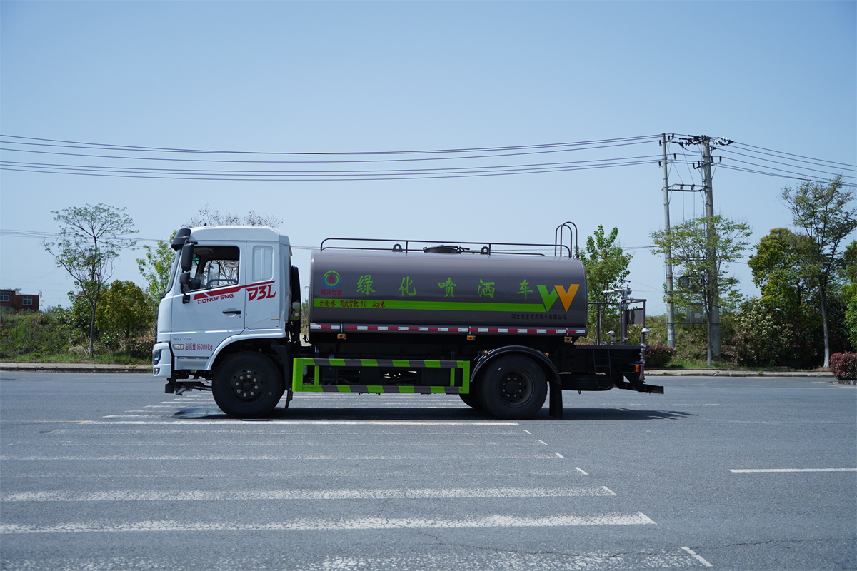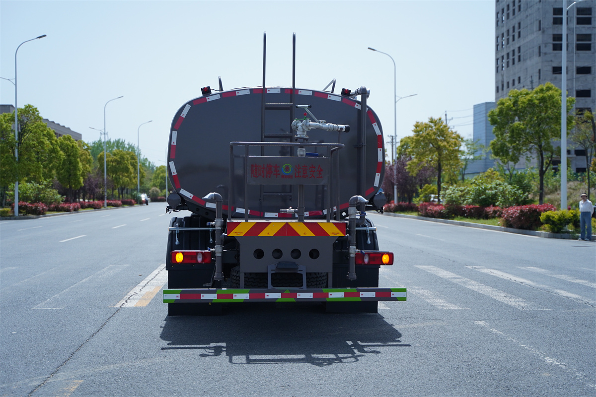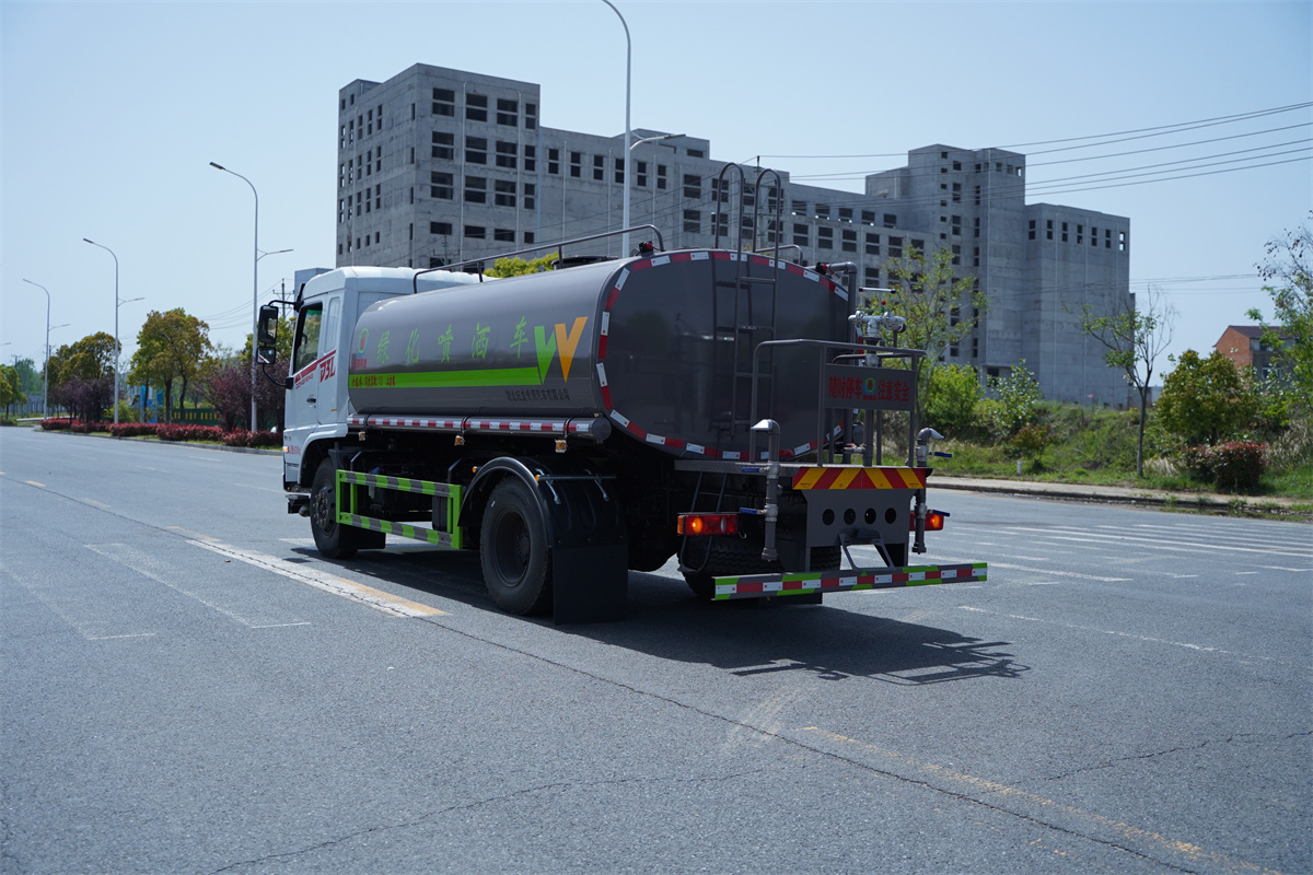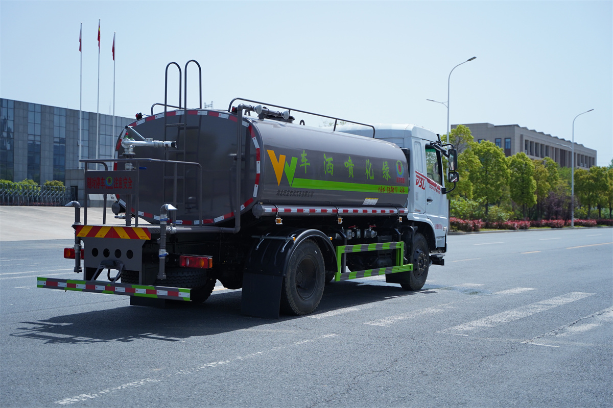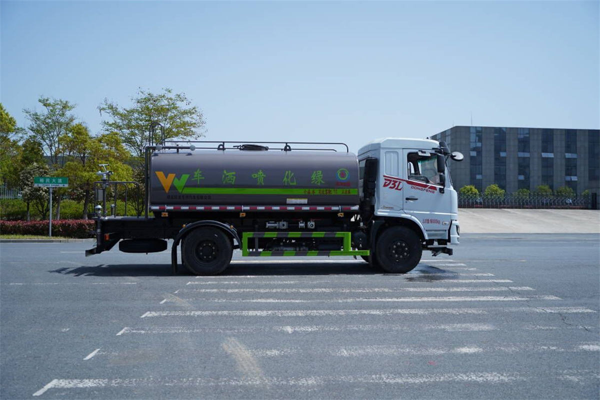 灑水車前裝有鴨形噴嘴或圓頭沖嘴,后面裝有圓柱開灑水噴嘴或蓮蓬頭噴嘴,后部有一工作平臺,裝配有水炮。后部還可裝8個噴嘴(選裝)。
