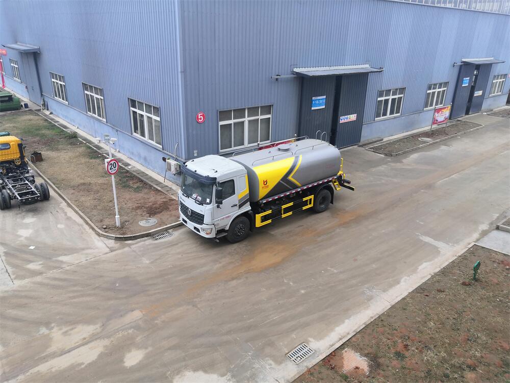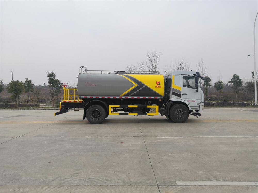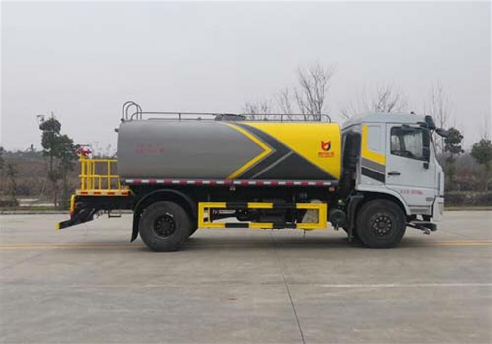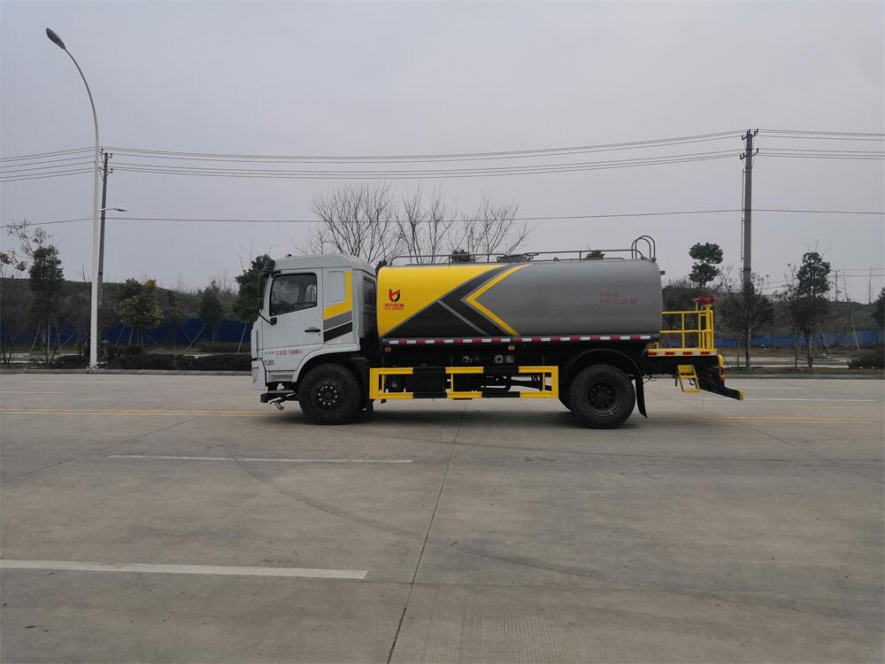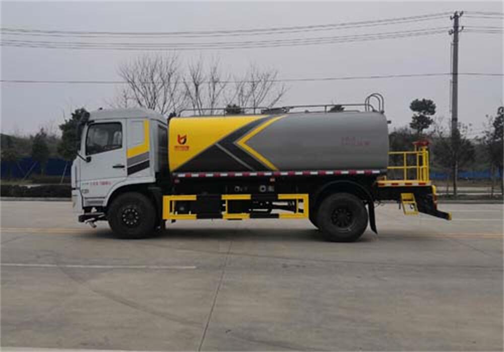 灑水車前裝有鴨形噴嘴或圓頭沖嘴,后面裝有圓柱開灑水噴嘴或蓮蓬頭噴嘴,后部有一工作平臺,裝配有水炮。后部還可裝8個噴嘴(選裝)。