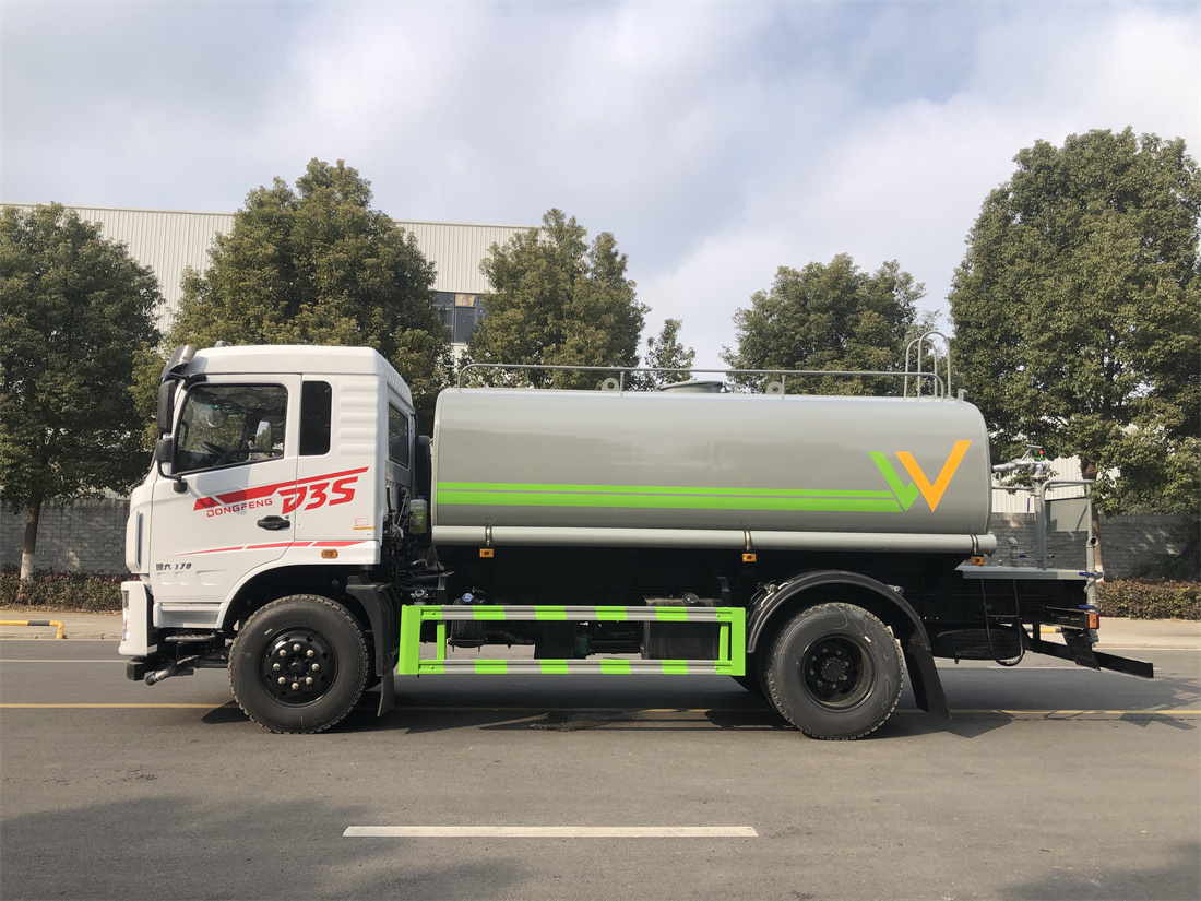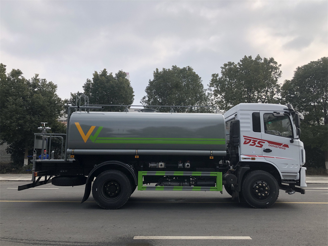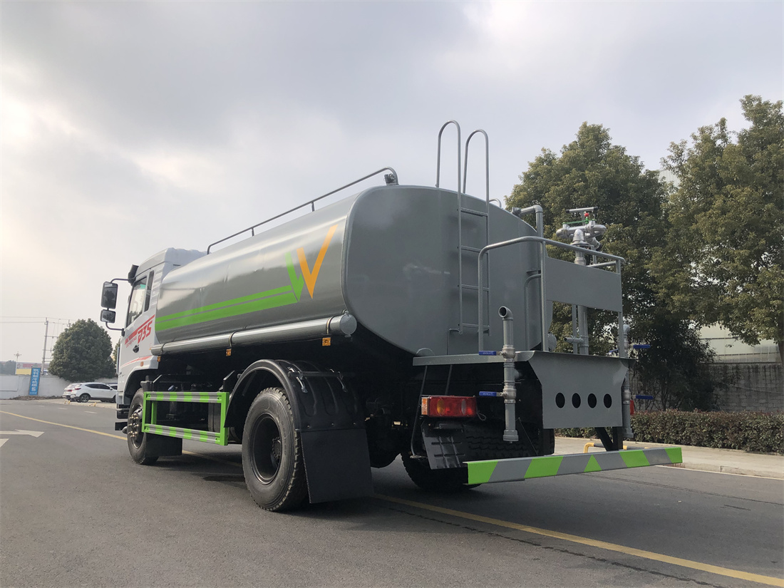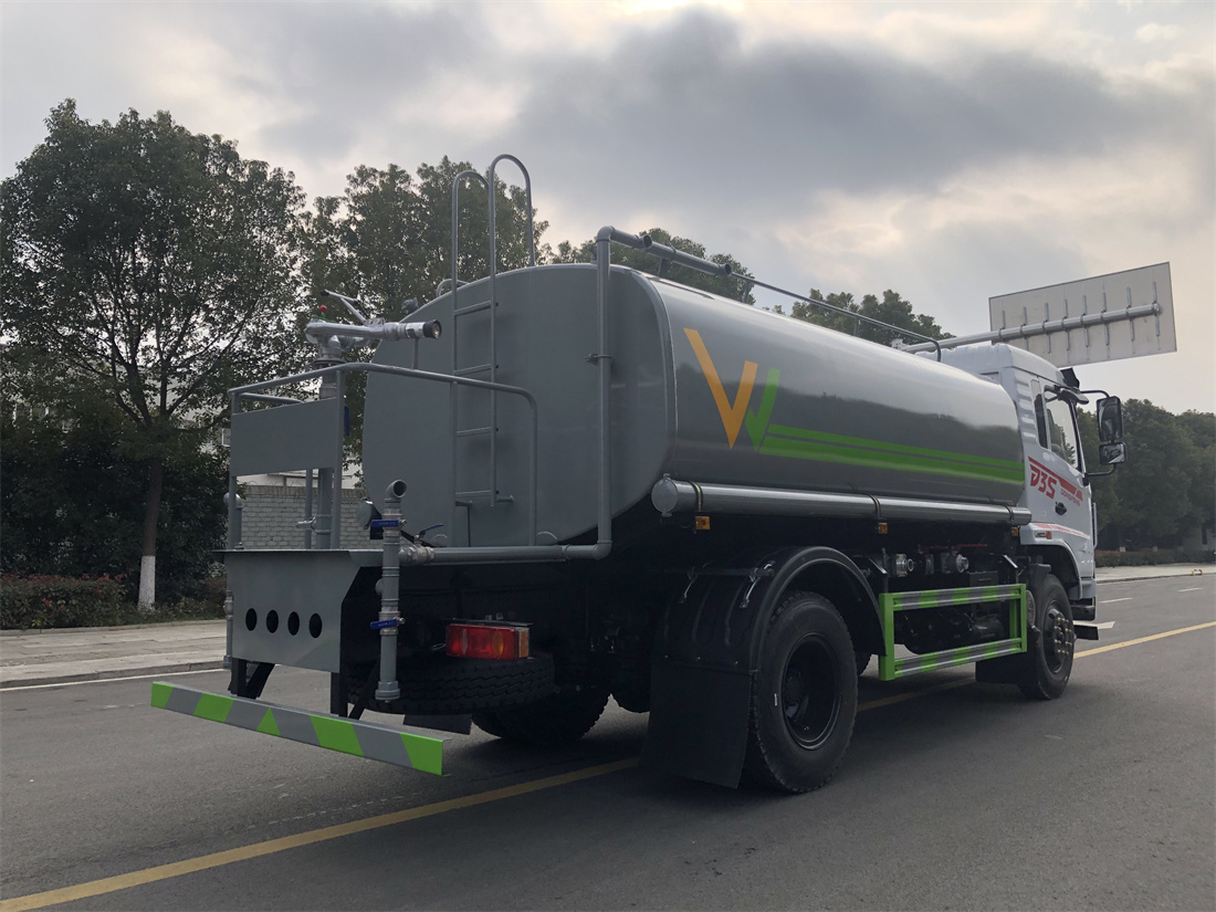灑水車前裝有鴨形噴嘴或圓頭沖嘴,后面裝有圓柱開灑水噴嘴或蓮蓬頭噴嘴,后部有一工作平臺,裝配有水炮。后部還可裝8個(gè)噴嘴(選裝)。