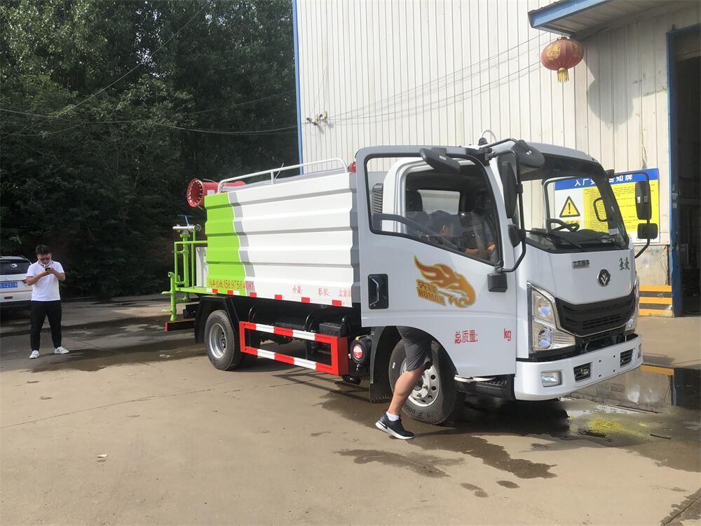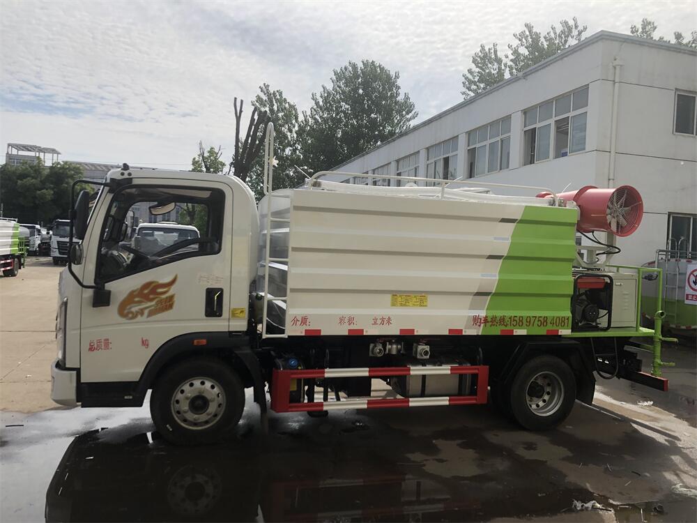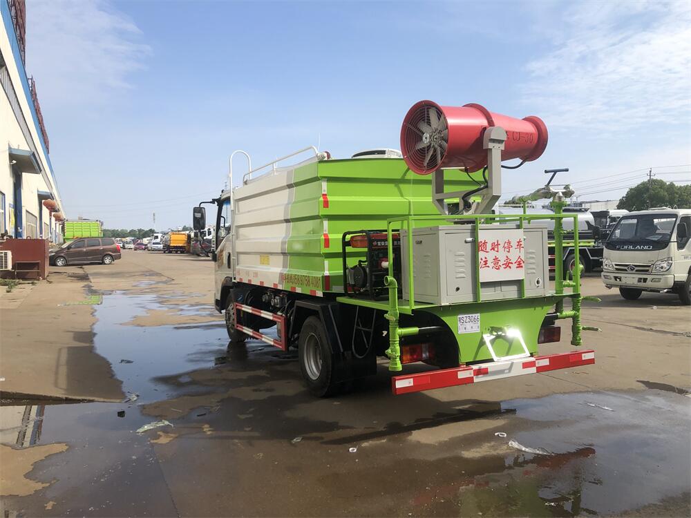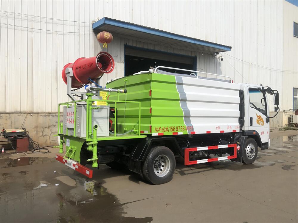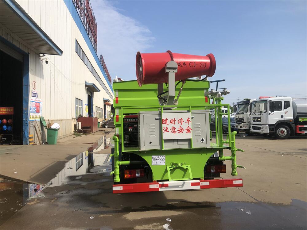 上裝配置:罐體容積為 5-7立方,選配風(fēng)送式霧炮機組射程30米、40米、50米、60米、80米、100米、120米霧炮,罐體鋼板為4mm碳鋼Q235材質(zhì),罐內(nèi)隔板具有防波作用,以減輕汽車行駛時罐體液體沖擊,罐體及整車外形尺寸按照公告。帶大功率專用灑水泵,泵可自吸自排,整車前沖、后灑、側(cè)噴、帶65消防接口,后平臺配CLW-50、CLW-60、CLW-80、CLW-100、CLW-120型風(fēng)送式霧炮機組;罐體前封頭配大功率柴油發(fā)電機組;前封頭帶水位計,后平臺主管路帶1寸澆花接口,后爬梯。帶兩根輸水管及陰陽端。罐體顏色:銀/灰/綠,罐體兩側(cè)噴“多功能抑塵車”字樣,貼反光標(biāo)示。