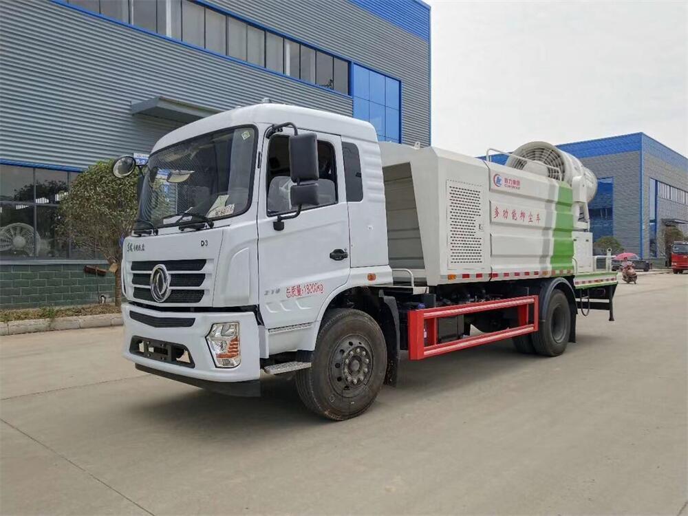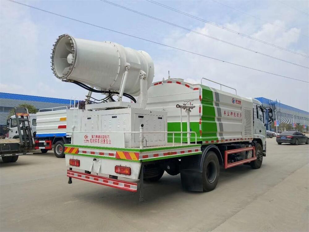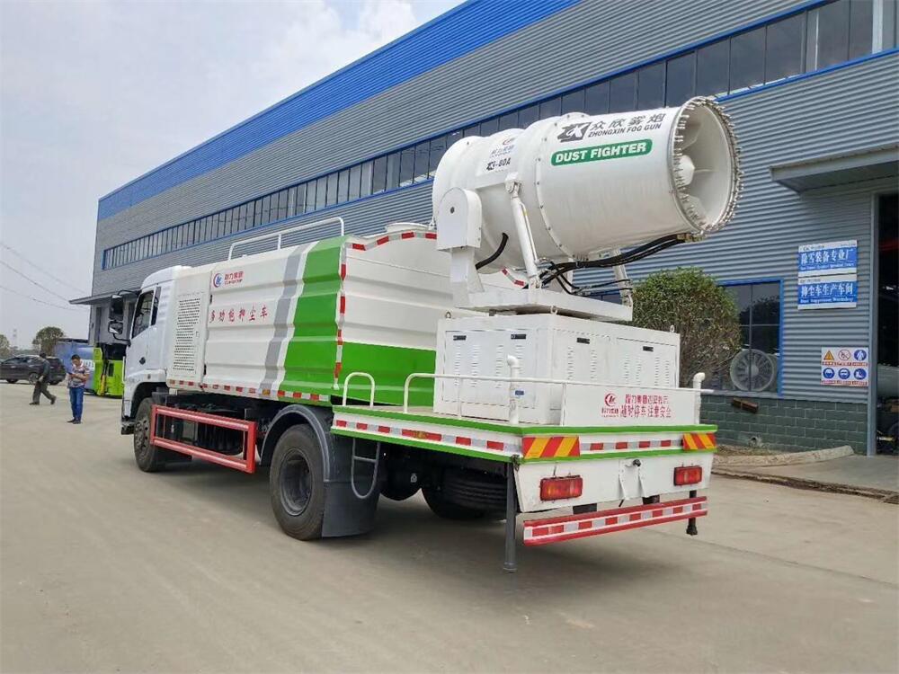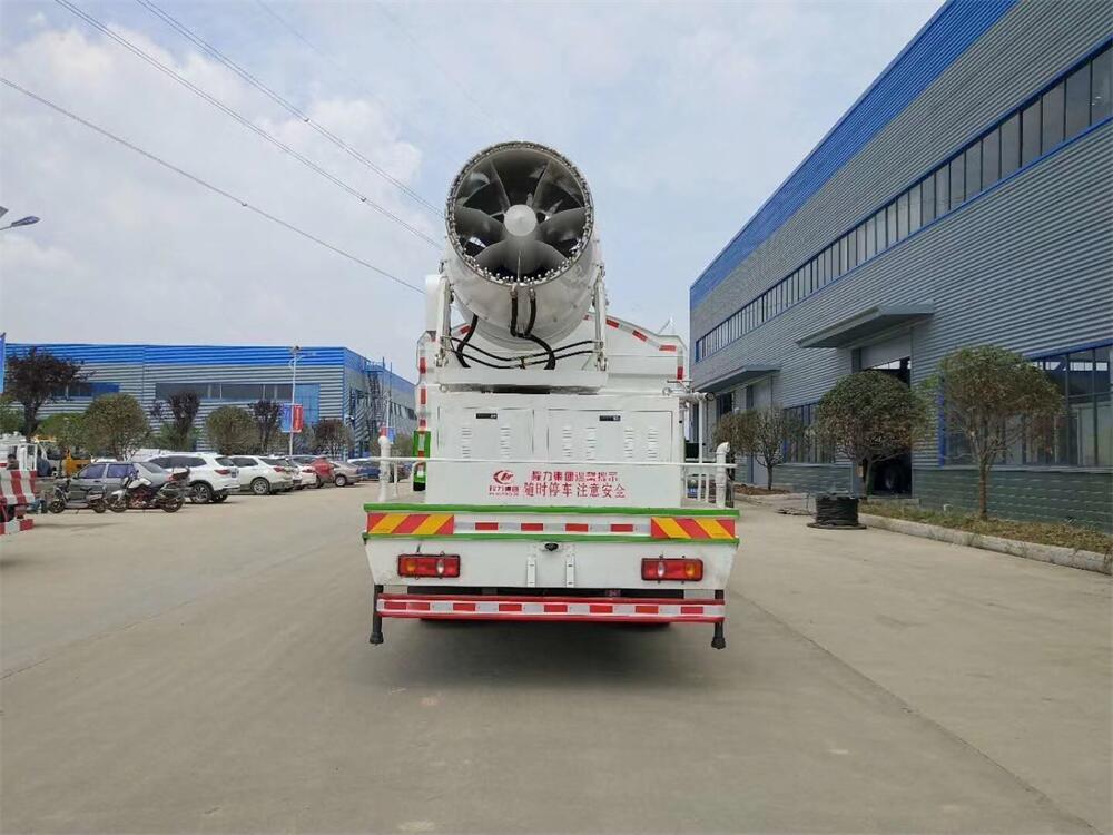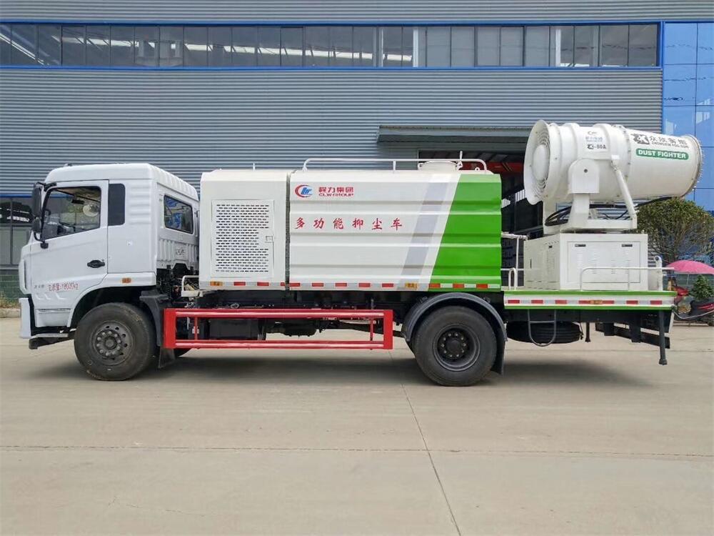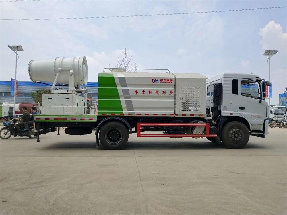 上裝配置:罐體容積為 12立方,選配風送式霧炮機組射程30米、40米、50米、60米、80米、100米、120米霧炮,罐體鋼板為4mm碳鋼Q235材質,罐內隔板具有防波作用,以減輕汽車行駛時罐體液體沖擊,罐體及整車外形尺寸按照公告。帶大功率專用灑水泵,泵可自吸自排,整車前沖、后灑、側噴、帶65消防接口,后平臺配CLW-50、CLW-60、CLW-80、CLW-100、CLW-120型風送式霧炮機組;罐體前封頭配大功率柴油發電機組;前封頭帶水位計,后平臺主管路帶1寸澆花接口,后爬梯。帶兩根輸水管及陰陽端。罐體顏色:銀/灰/綠,罐體兩側噴“多功能抑塵車”字樣,貼反光標示。