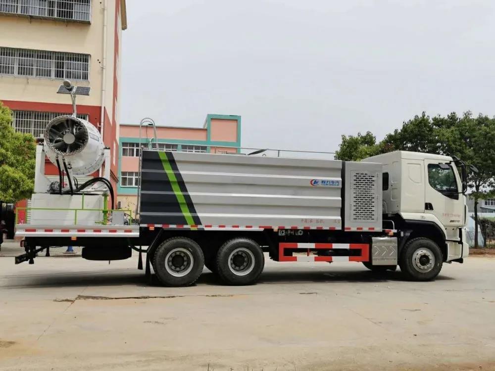 上裝配置:罐體容積為 16立方,選配風送式霧炮機組射程30米、40米、50米、60米、80米、100米、120米霧炮,罐體鋼板為4mm碳鋼Q235材質,罐內隔板具有防波作用,以減輕汽車行駛時罐體液體沖擊,罐體及整車外形尺寸按照公告。帶大功率專用灑水泵,泵可自吸自排,整車前沖、后灑、側噴、帶65消防接口,后平臺配CLW-50、CLW-60、CLW-80、CLW-100、CLW-120型風送式霧炮機組;罐體前封頭配大功率柴油發電機組;前封頭帶水位計,后平臺主管路帶1寸澆花接口,后爬梯。帶兩根輸水管及陰陽端。罐體顏色:銀/灰/綠,罐體兩側噴“多功能抑塵車”字樣,貼反光標示。