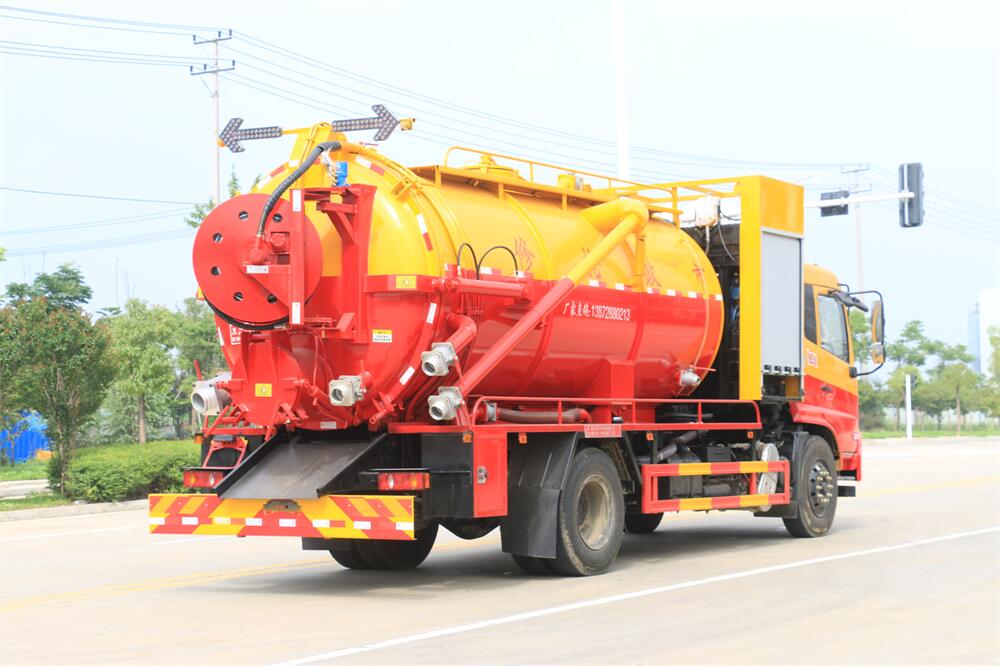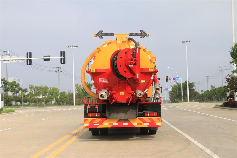 上裝配置:清水罐約 5 立方,污水罐約 10 立 方;罐體 8mm 厚,封頭 8mm 厚,水罐、污罐可 互通,用 100 球閥**開關;清洗部份采用天 津通潔高壓泵,壓力 19Mpa,流量 215L/min, 配 80 米直徑 22 高壓管帶液壓卷盤;吸污部份 采用濰柴375馬力副發動機帶山東SK-30水循 環泵(副發自帶),吸污罐帶舉升,后封頭焊 死(可選擇后封頭全開),尾部加裝一個 600mm 快開,罐體后尾部一個 DN150 排污口球閥,一 個 DN100 吸污球閥帶出口盤,一個視污窗,一 根 10m 吸污管,一套陰陽端,壓力表,防溢 閥,箭頭燈,工具箱,淋管裝置,高壓泵帶氣 吹水。配一個 4.5 公斤水雷噴頭,另帶一個 80 公分手持洗車噴頭。