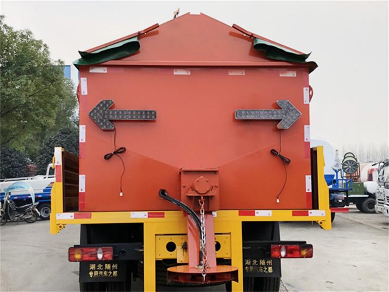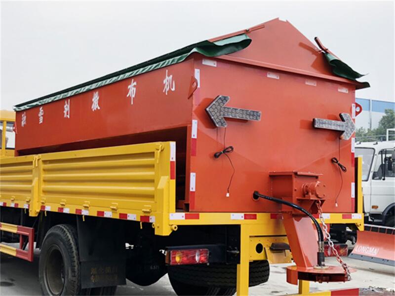 發動機帶動導輥旋轉,把料箱中的融雪劑輸送到撒布斗,通過撒布斗的旋轉把融雪劑均勻撒布到路面。